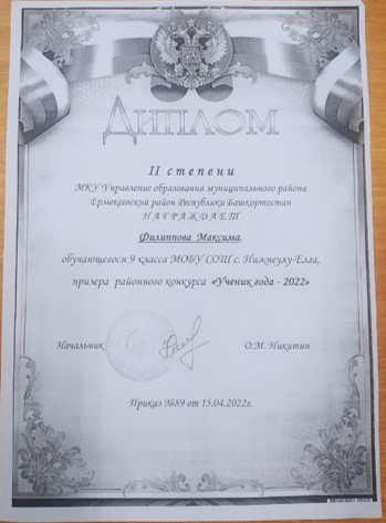 Филиппов М. обучающийся 9 класса стал призером районного конкурса «Ученик года – 2022», занявшим почётное 2 место.