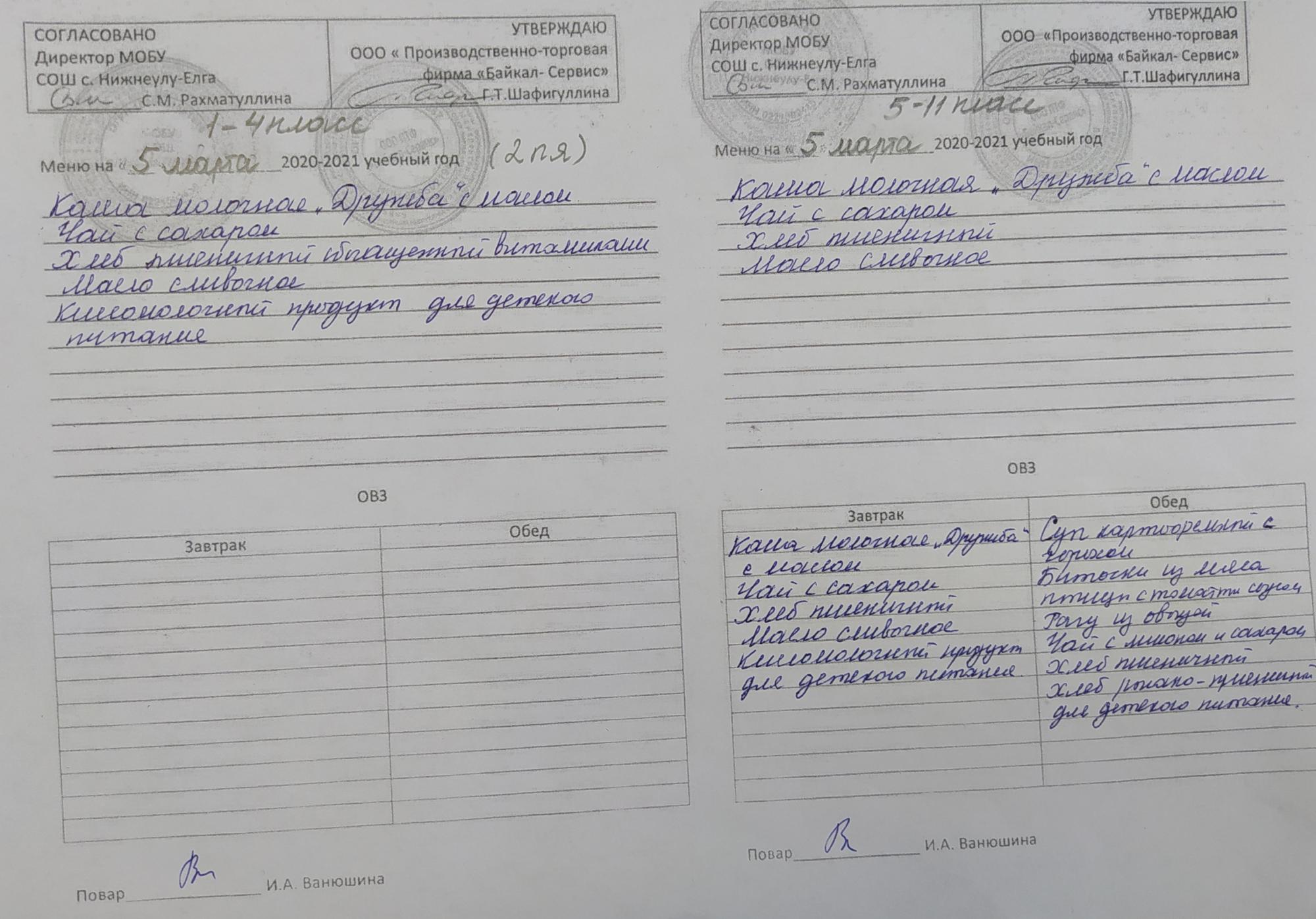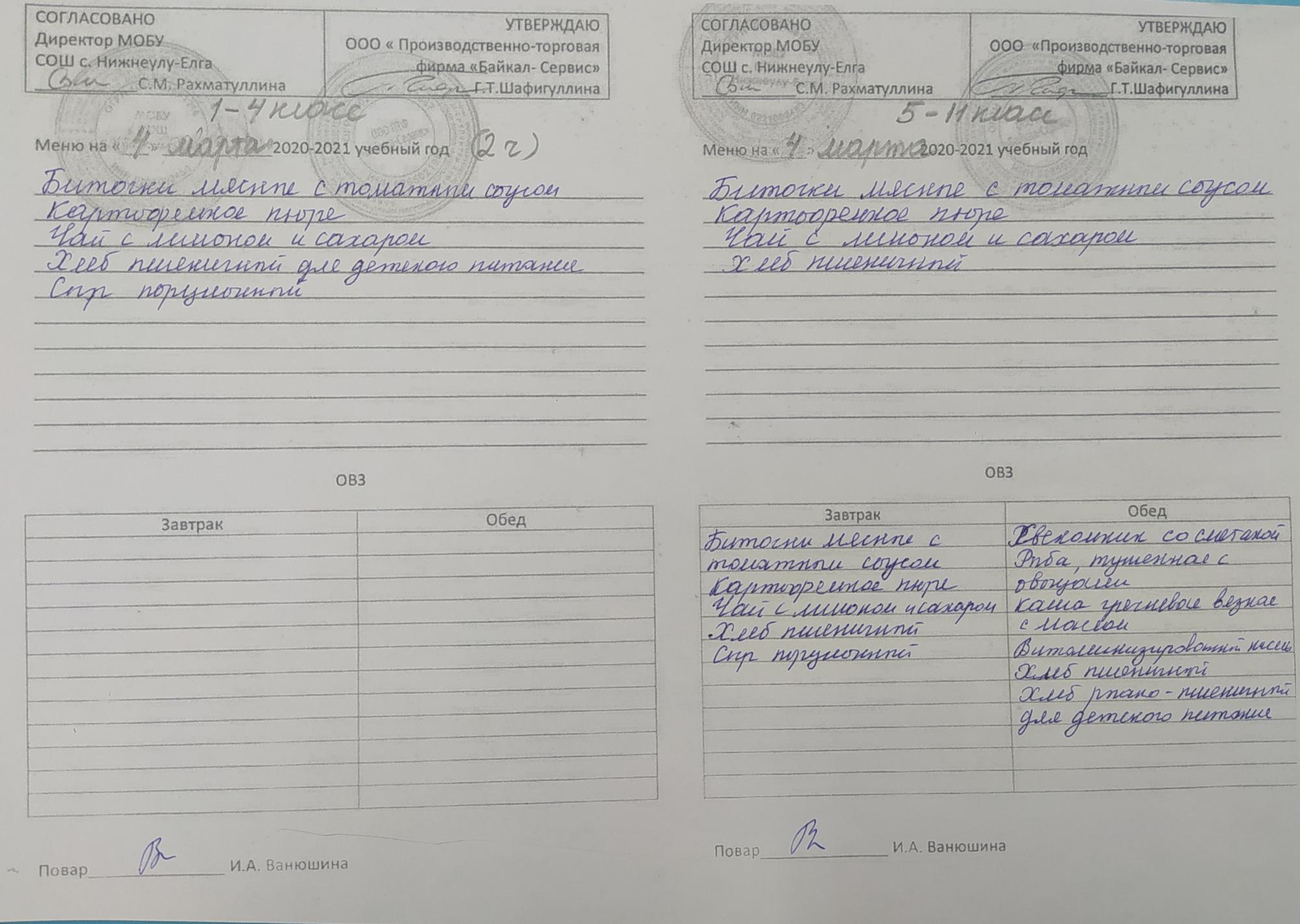 Примерное меню