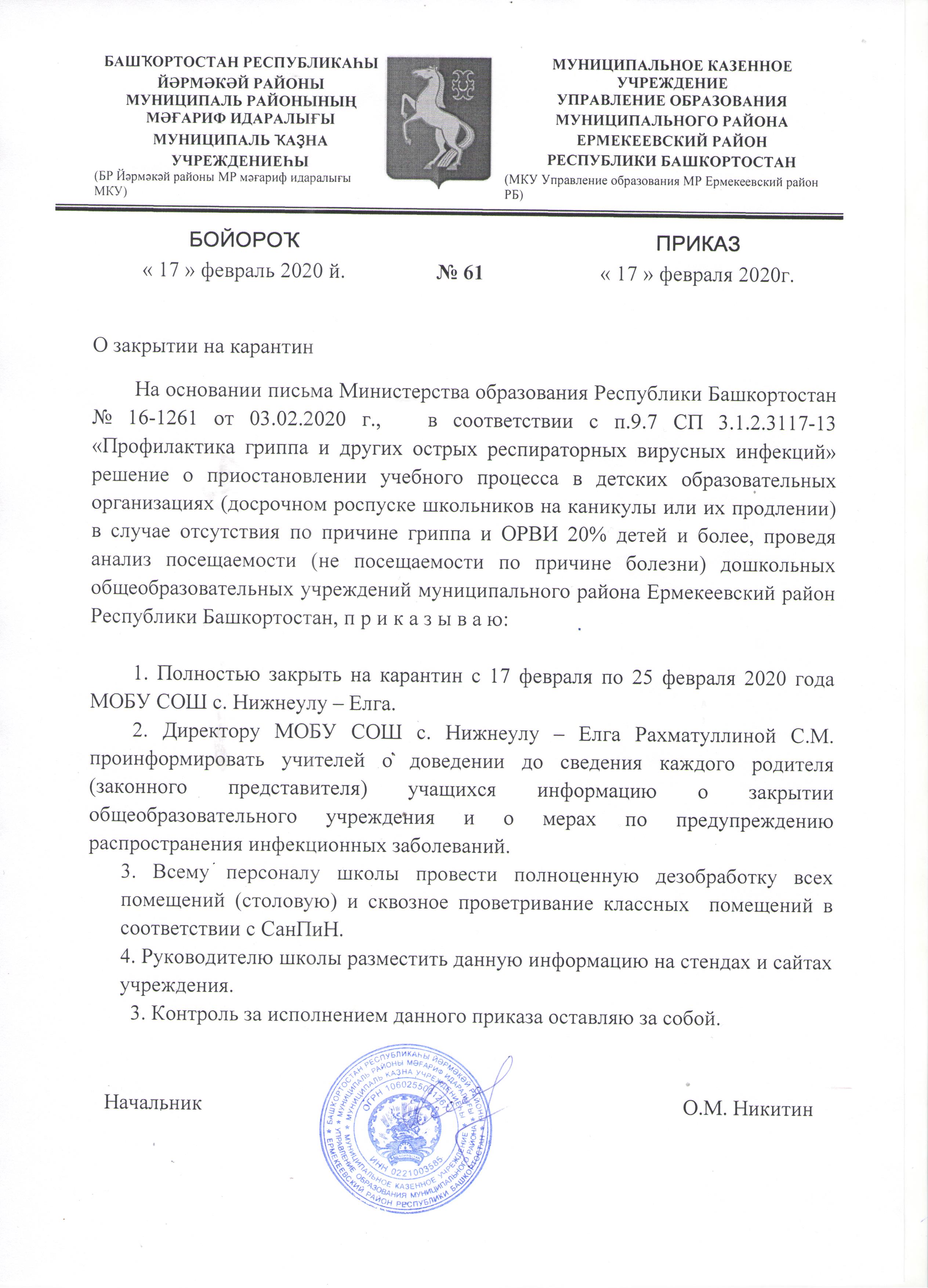 Приказ УО муниципального района Ермекеевский район о закрытии школы на карантин
