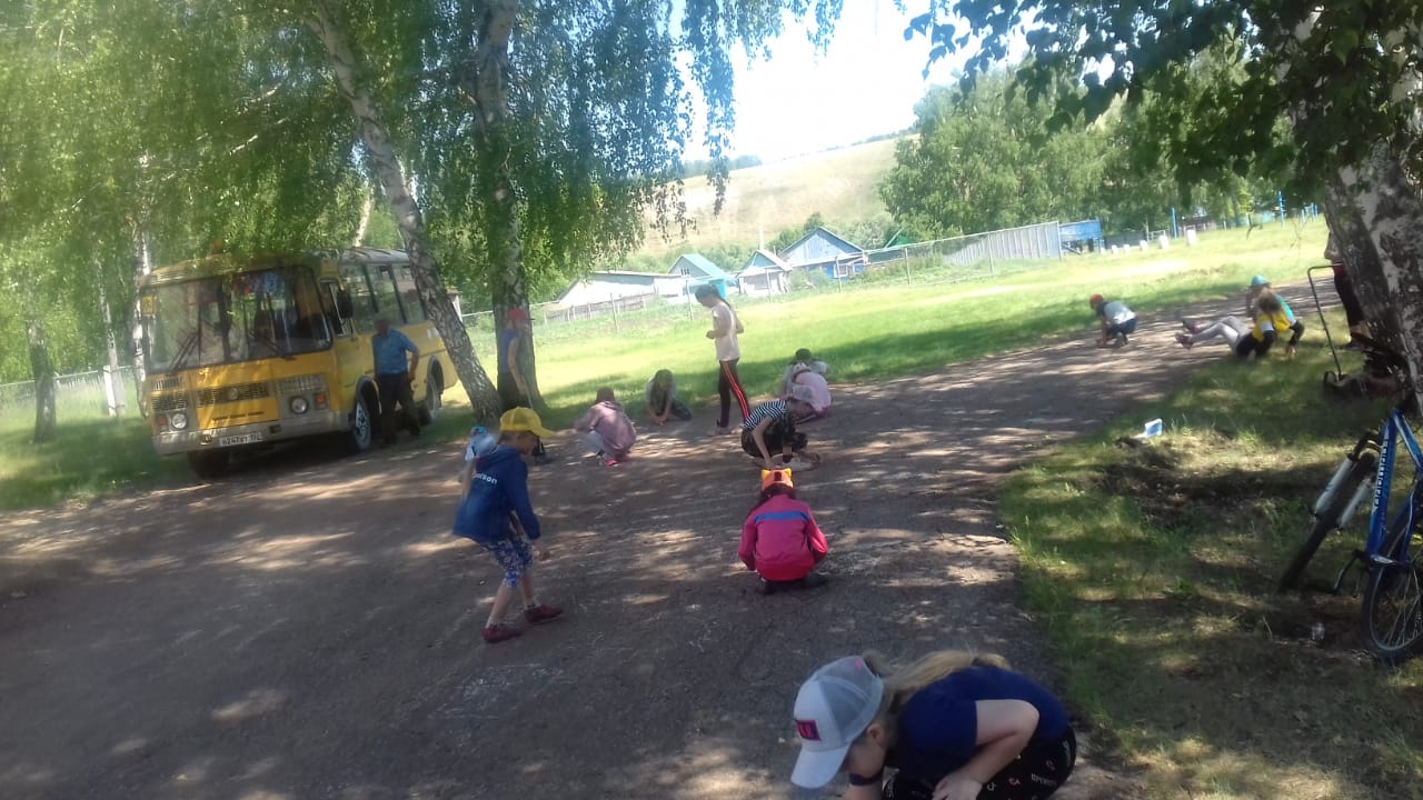 Трудовой десант, экскурсия в ДШИ с.Ермекеево, конкурс "Человек читающий " по символам России , состязание "Аты- баты шли солдаты", творческая мастерская "Рисуем на асфальте" конкурс "Пусть всегда будет солнце".
